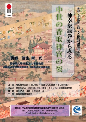 香取市に所在する多くの文化財への関心と、文化財の保存、活用について理解を深めていただくため、令和7年度第2回文化財講演会を令和8年2月14日(土)に開催します。テーマは、令和8年4月に行われる、12年に一度の香取神宮式年神幸祭に関連して「神幸祭絵巻からみる中世の香取神宮の姿」です。香取神宮神幸祭絵巻を基に、中世以前に香取神宮で行われていた神幸祭を中心に取り上げます。