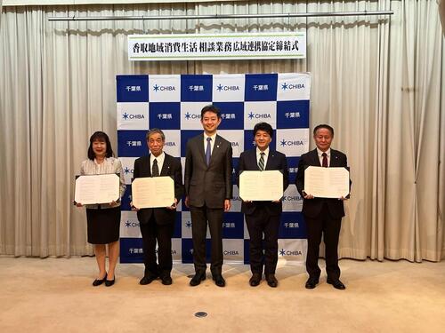 香取地域での専門的かつきめ細かな消費生活相談対応を更に推進するため、消費生活相談業務にかかる広域連携を令和8年4月からスタートするにあたり、千葉県知事の立ち合いのもと、香取4市町長による協定式を開催しました。