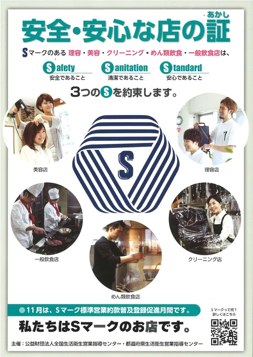 標準営業約款制度は、法律で定められた消費者(利用者)擁護に資するための制度です。厚生労働大臣認可の約款に従って営業することを登録した、「理容店」、「美容店」、「クリーニング店」、「めん類飲食店」、「一般飲食店」では、店頭にSマークを掲げています。