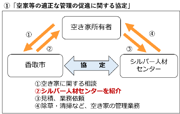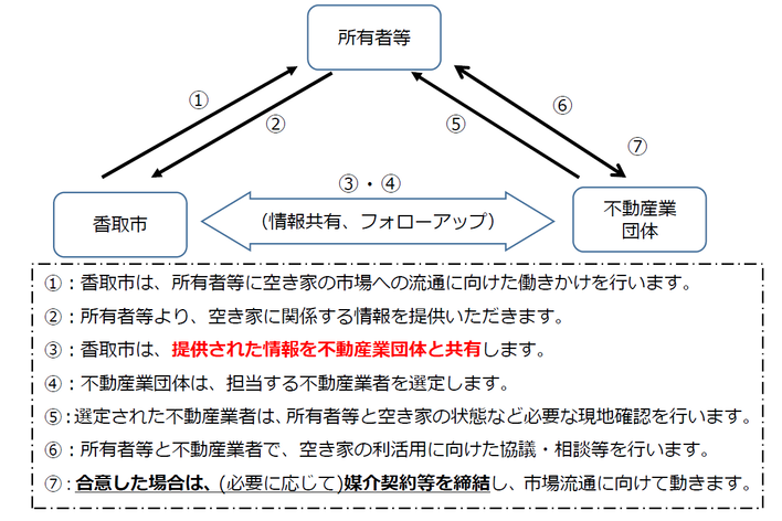 空き家を利活用(売買、賃貸、譲渡等)したい所有者の方のご相談に、不動産業団体の会員(香取市内の不動産業者)が対応します。市は、相談を希望する所有者から同意をいただき、不動産業団体に対して空き家及び所有者の情報を提供します。その後、不動産業団体の会員と所有者を直接つなげ、不動産の専門家である不動産業団体の会員による相談対応を行い、空き家状態の解消を目指します。