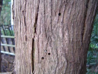 脱出孔が確認できると、ケブカトラカミキリの被害と断定できます。(写真4)