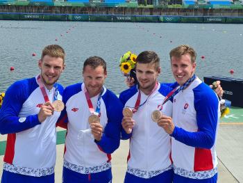 市内の小見川ボート場で事前キャンプを行ったスロバキアカヌースプリントチームが、最も得意とするカヤックフォア(K4)種目で、銅メダルを獲得しました。