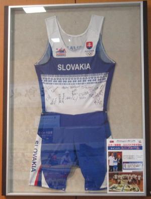 スロバキアの事前キャンプ記念とし、カヌースプリントチームのサイン入りユニフォームを市役所に展示しました。