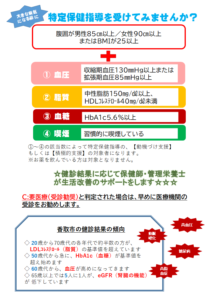 特定健診や人間ドックの結果から、「特定保健指導」の対象者に該当した方には通知を発送し、保健師や管理栄養士などの専門職が、からだを改善するためのお手伝いをします。