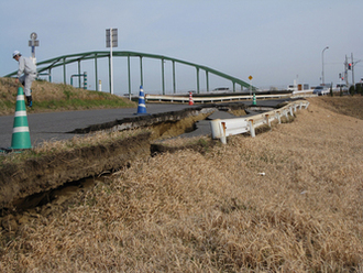 横利根川堤防が崩れ路面に亀裂と歪みが生じた