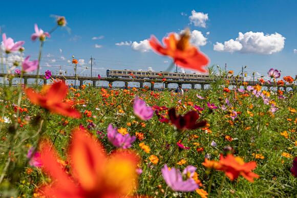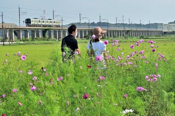 無料のコスモス摘み取りや、高架橋を走る列車と写真を撮れるカメラスポットとしても人気です。