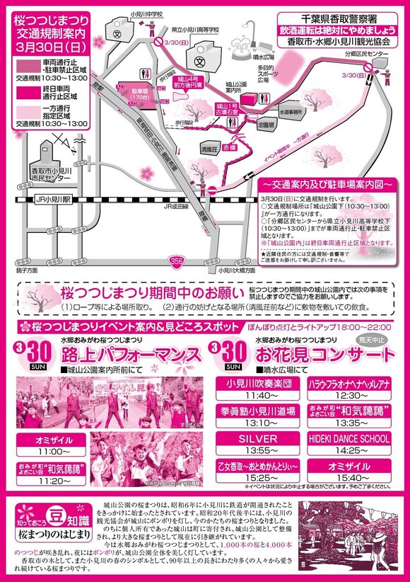 - イベント当日は、城山公園頂上付近にある小見川城山公園第一駐車場が関係者及び障害者専用となります。
