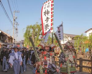 式年神幸祭の歴史的装束をまとい小野川沿いを巡行する写真