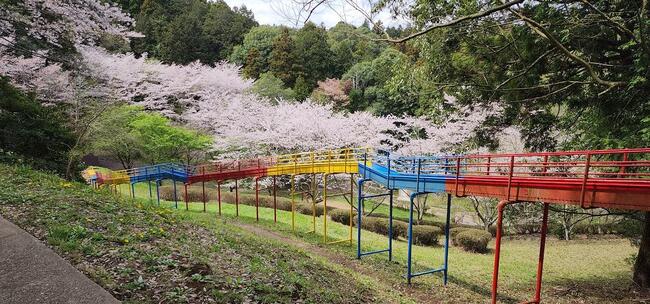 橘堰を見下ろせる里山の高台に作られた「憩いの森」には、山の傾斜や高低差を生かした遊具が多数設置してあります。