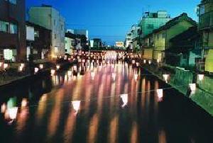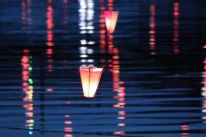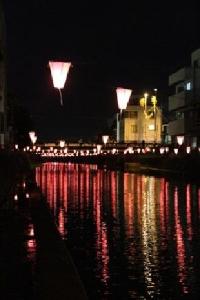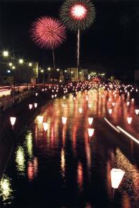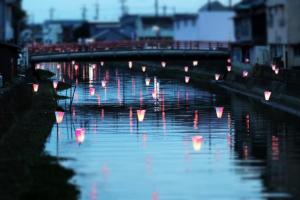 Paper lanterns with wishes from the local children written on them are hung over the Kurobe River and lit up.
