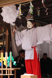 Today, Ki-no-Uchi Kagura, which consists of 12 kagura performances, continues to be passed down by a local volunteer organization called Ki-no-Uchi Kagura Preservation Committee. Ki-no-Uchi Kagura is performed during the religious festival on March 3rd to pray for shrine parishioners’ tranquility, abundant harvest, and thriving business. It is also performed at Suga Shrine’s religious festival on April 3rd.